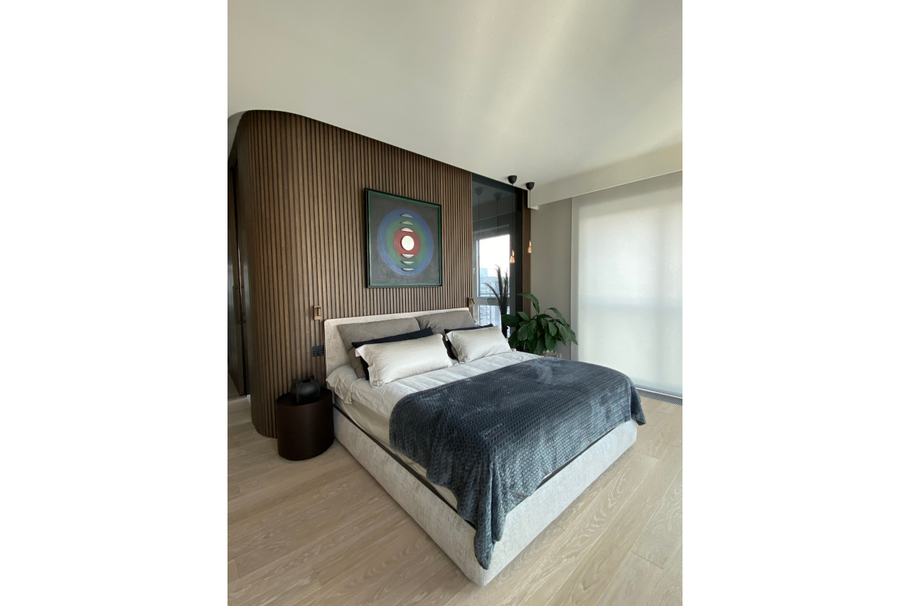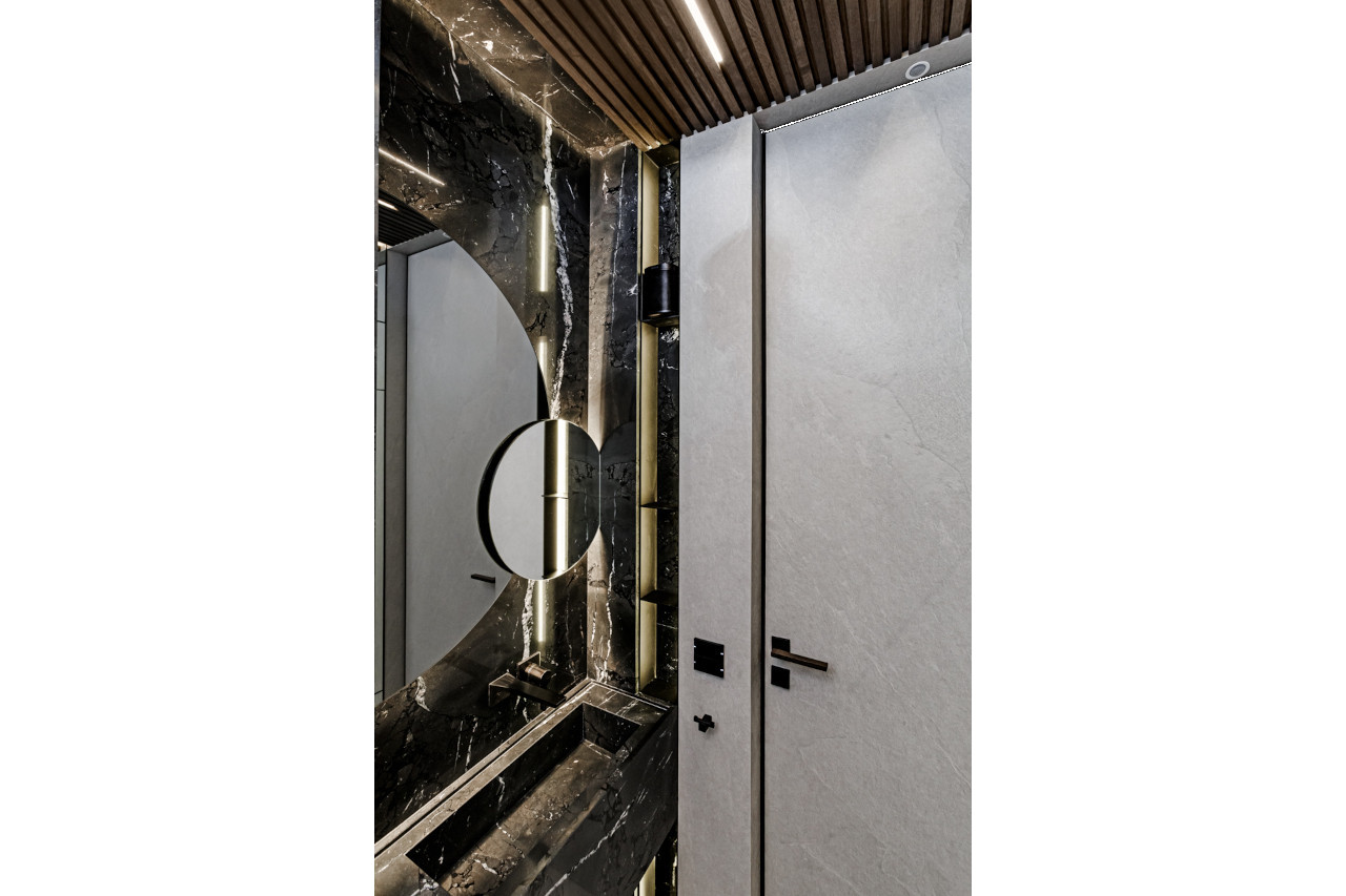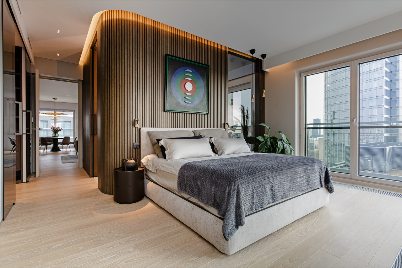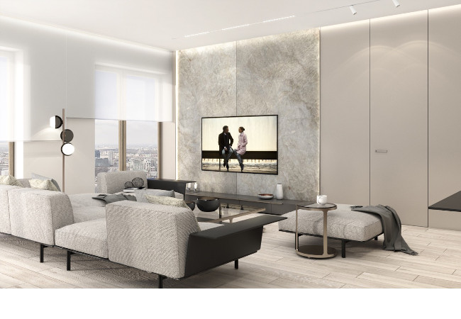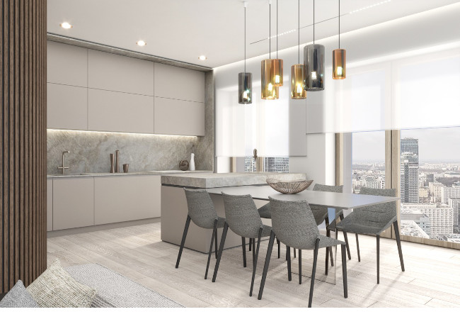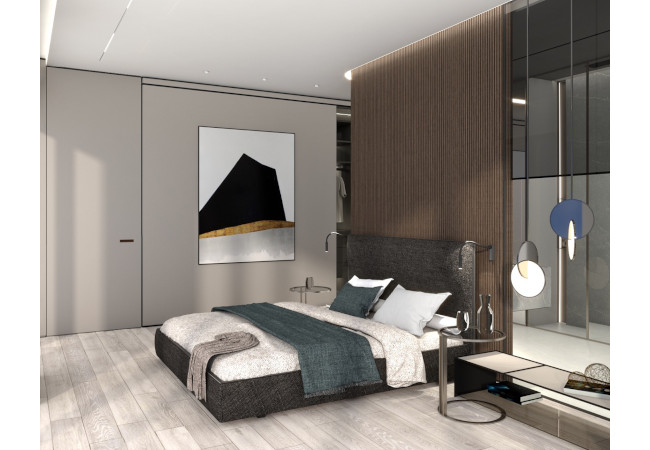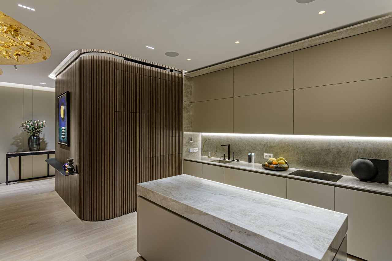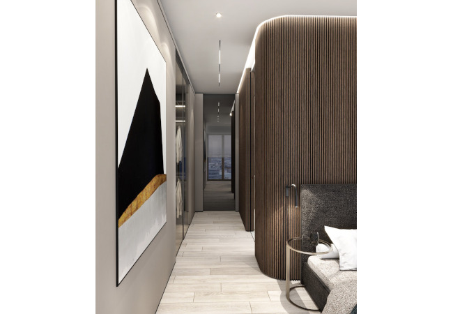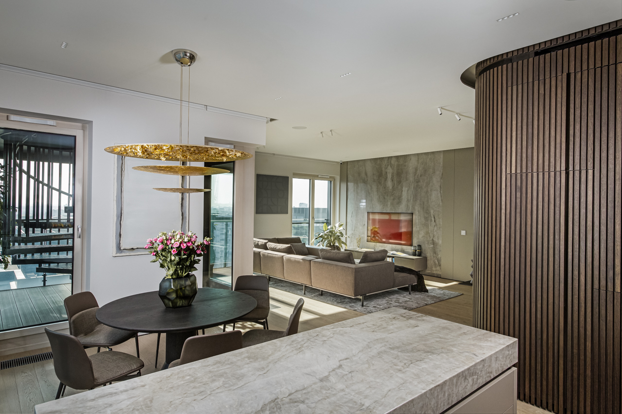 Main recommendation from the Swedish client was to create a modern, dynamic, yet relaxing interior. We decided do extensive work on the color palette, with reduced contrast, so it could would resemble sharp Scandinavian light, being relaxing and calming but not boring at the same time. As the inspiration for colors we analyzed some space age paintings by Anna Eva Bergman, Norwegian abstract painter fascinated by the intergalactic juxtaposition of dynamism and eternal peace. As the result we developed a particular language mixing some mid century curves and colors with the latest furniture and lightnings. We were lucky enough to find an exquisite stone – quartzite, to be used in the kitchen and living area. Brazilian stone Perla Santana has a very unique grey beige shade and silver/gold natural lines.