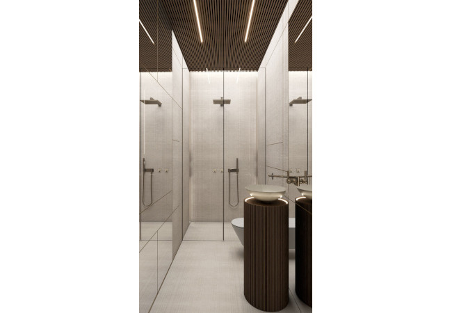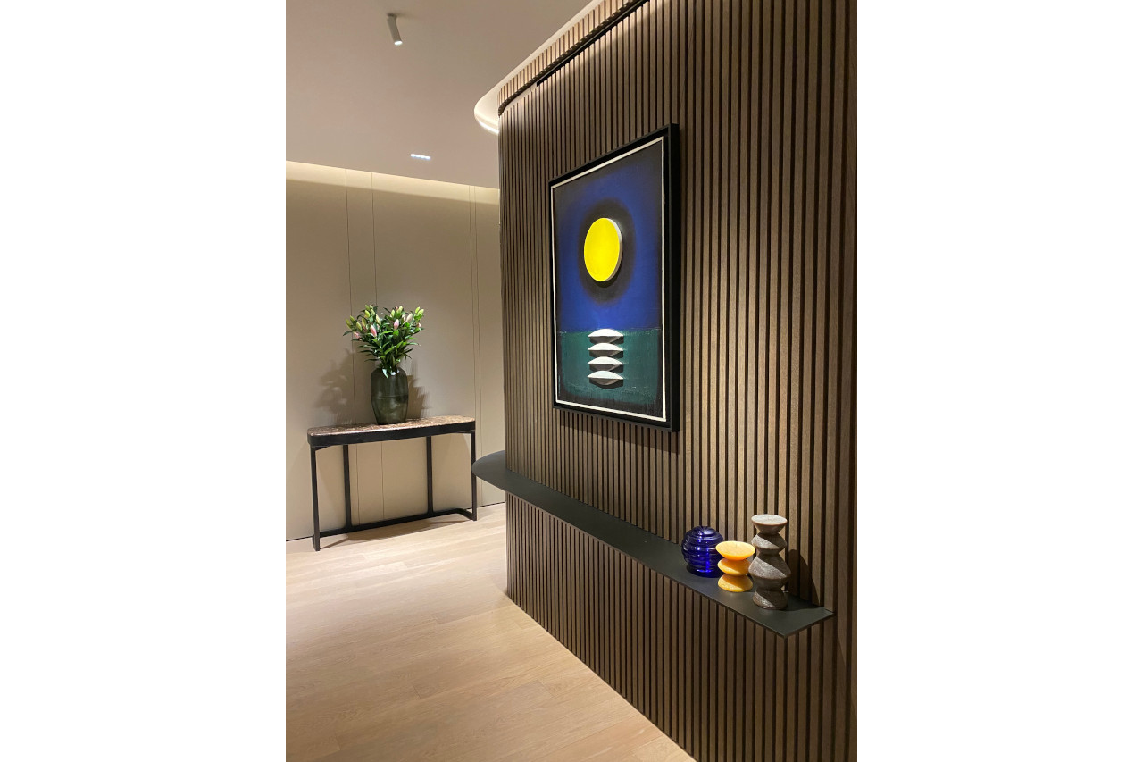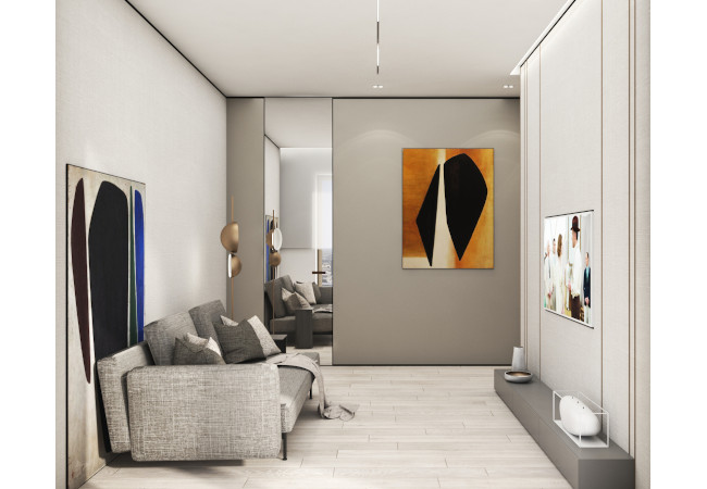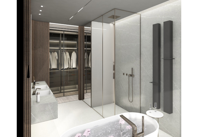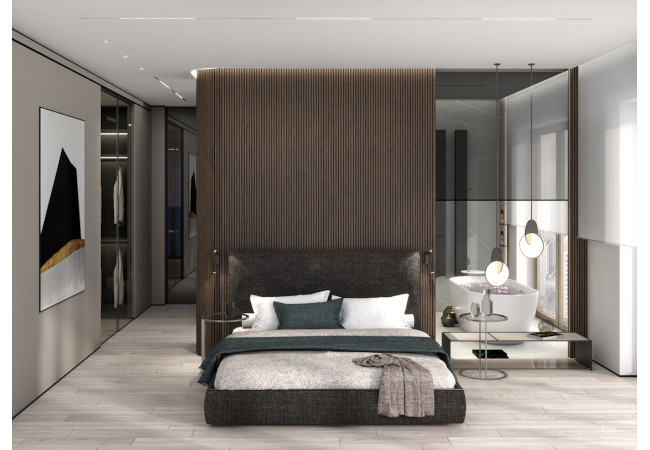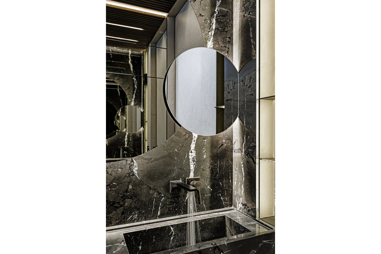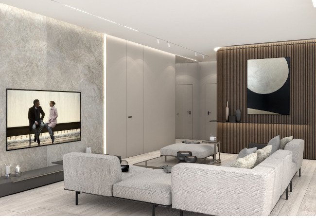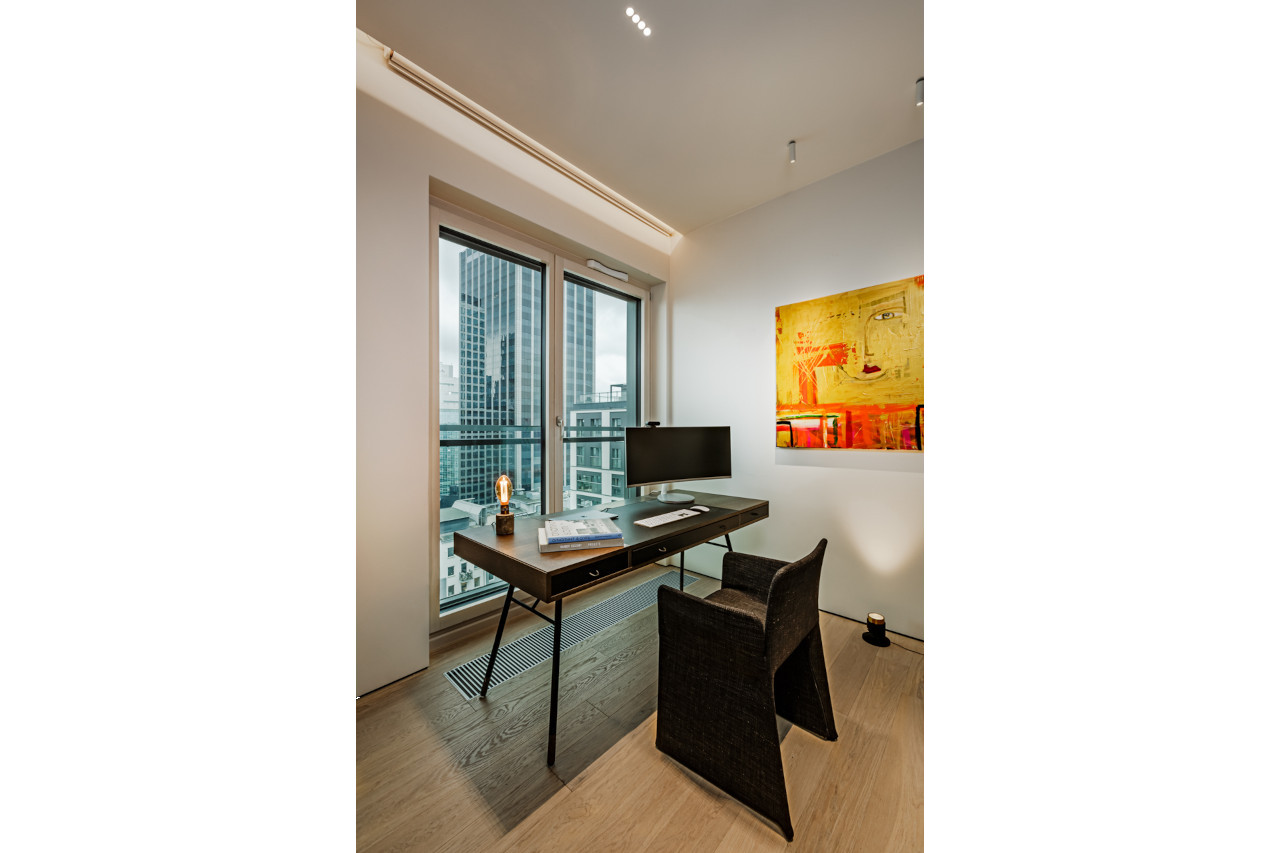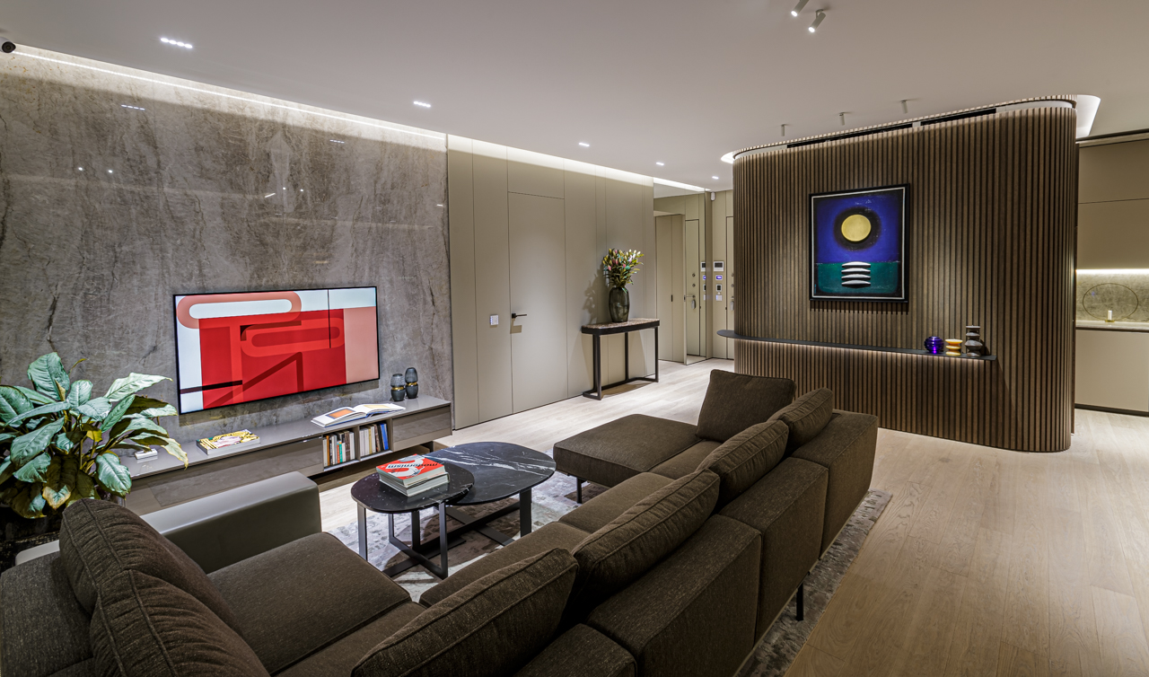 Main recommendation from the Swedish client was to create a modern, dynamic, yet relaxing interior. We decided do extensive work on the color palette, with reduced contrast, so it could would resemble sharp Scandinavian light, being relaxing and calming but not boring at the same time. As the inspiration for colors we analyzed some space age paintings by Anna Eva Bergman, Norwegian abstract painter fascinated by the intergalactic juxtaposition of dynamism and eternal peace. As the result we developed a particular language mixing some mid century curves and colors with the latest furniture and lightnings. We were lucky enough to find an exquisite stone – quartzite, to be used in the kitchen and living area. Brazilian stone Perla Santana has a very unique grey beige shade and silver/gold natural lines.