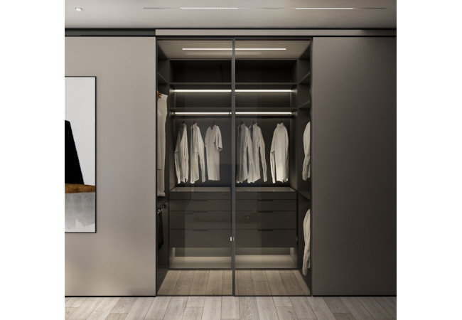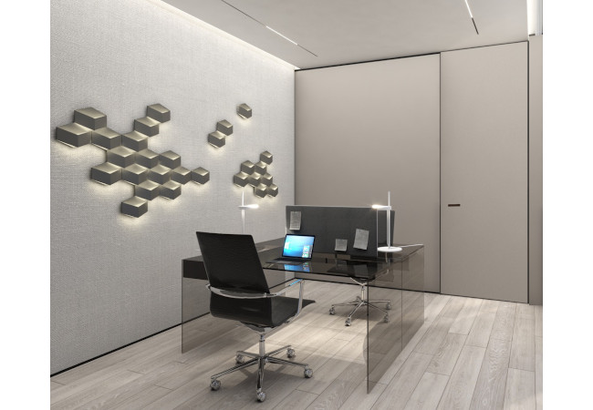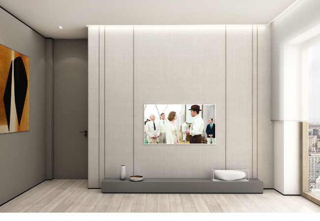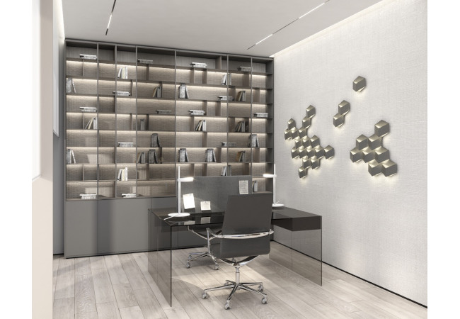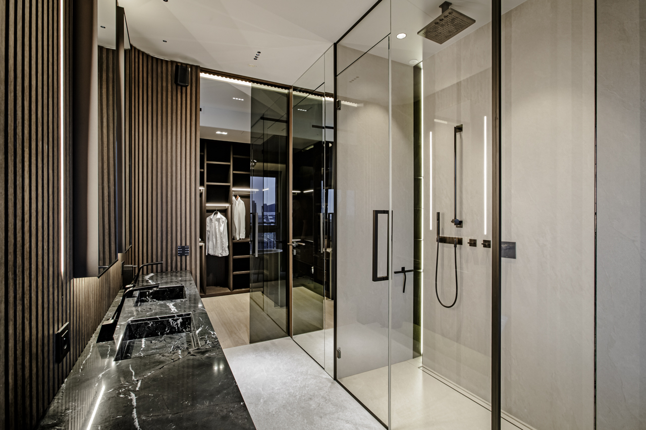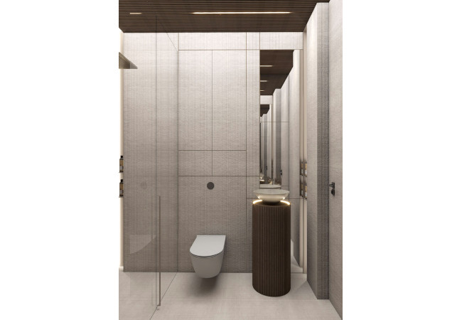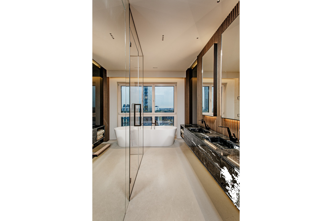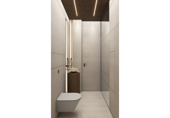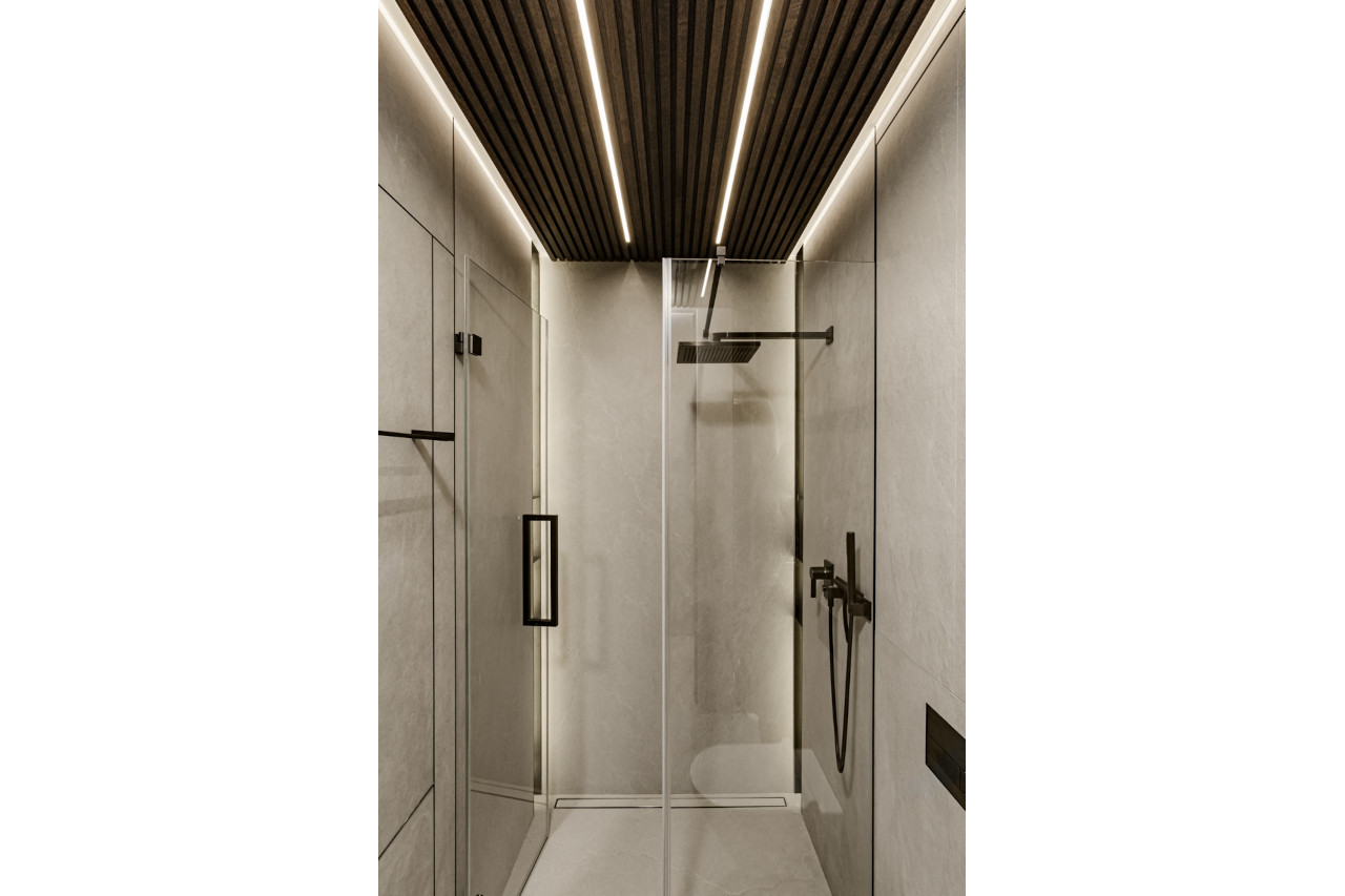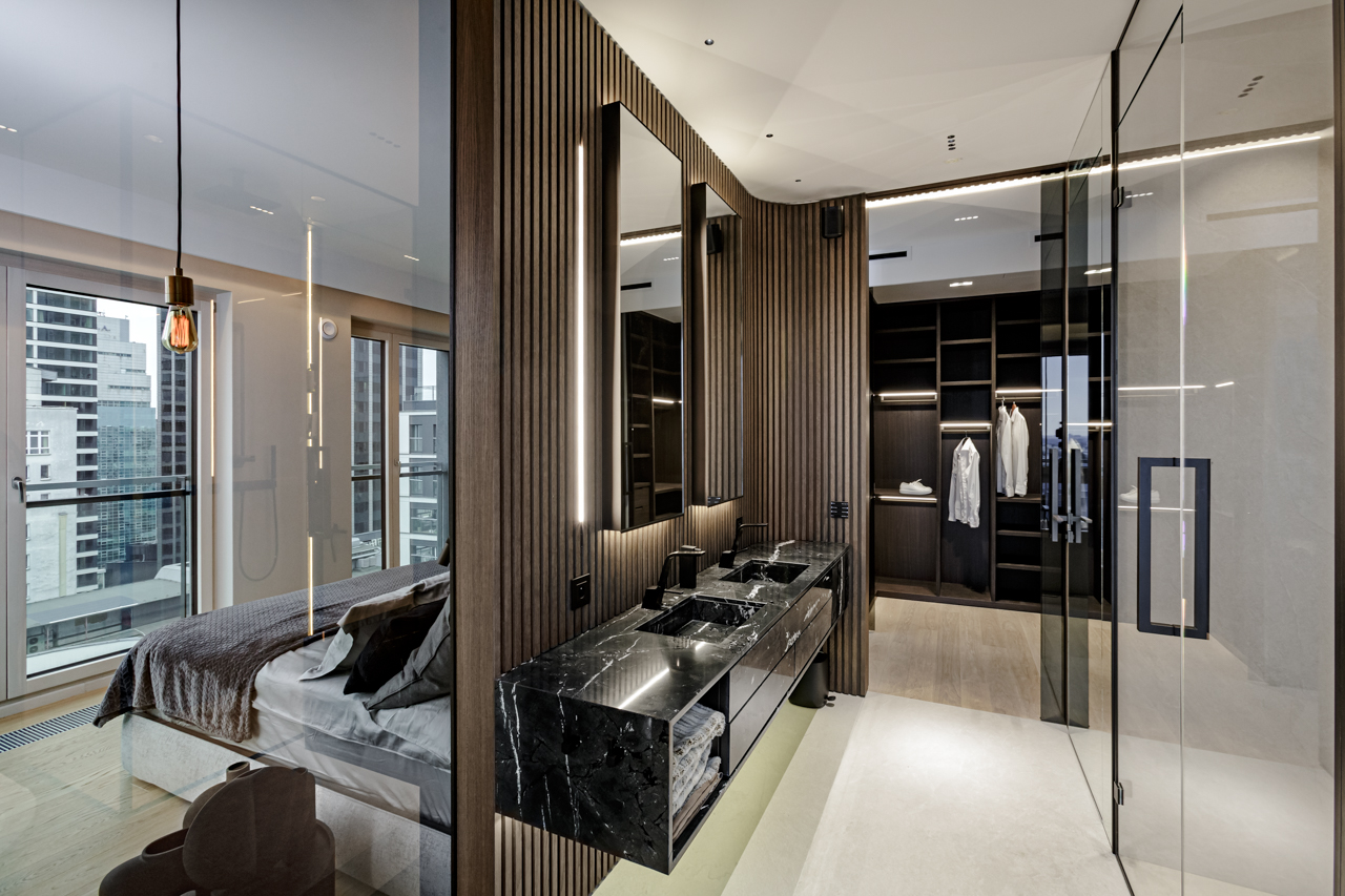 Main recommendation from the Swedish client was to create a modern, dynamic, yet relaxing interior. We decided do extensive work on the color palette, with reduced contrast, so it could would resemble sharp Scandinavian light, being relaxing and calming but not boring at the same time. As the inspiration for colors we analyzed some space age paintings by Anna Eva Bergman, Norwegian abstract painter fascinated by the intergalactic juxtaposition of dynamism and eternal peace. As the result we developed a particular language mixing some mid century curves and colors with the latest furniture and lightnings. We were lucky enough to find an exquisite stone – quartzite, to be used in the kitchen and living area. Brazilian stone Perla Santana has a very unique grey beige shade and silver/gold natural lines.